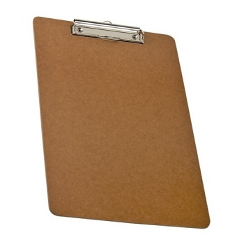 Old style traditional clipboard with large, lever style spring loaded clip. Includes a retractable hanging hook. Manufactured from masonite hardboard. Foolscap size. Price each.