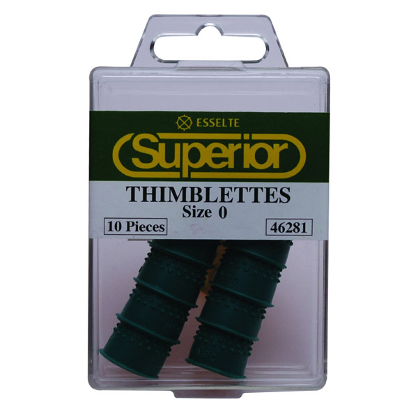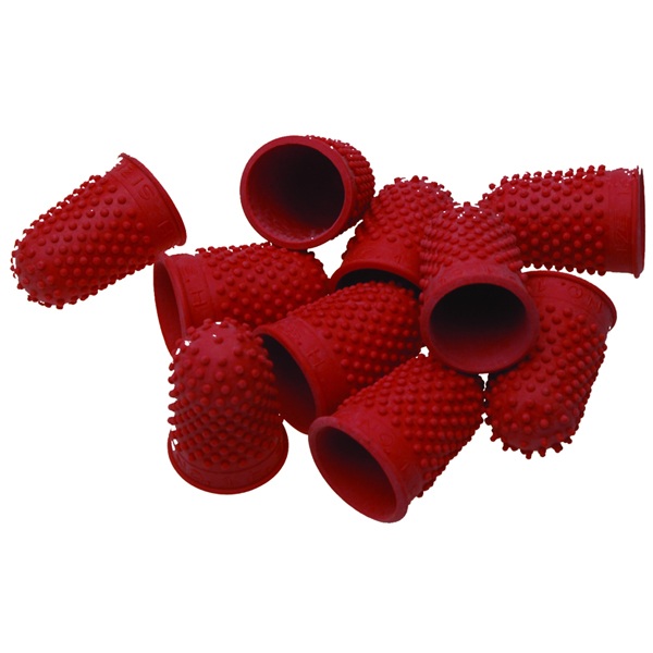 Thimblettes (also known as rubber finger, rubber thimbles and finger cones) are soft thimbles, made predominately of rubber, used primarily for leafing through or counting documents, bank notes, tickets or forms. They also protect against paper cuts as a secondary function. The surface is dimpled with the dimples inverted to provide better grip. Thimblettes are colour coded and sized from 00 through to 3 to fit all fingers.
